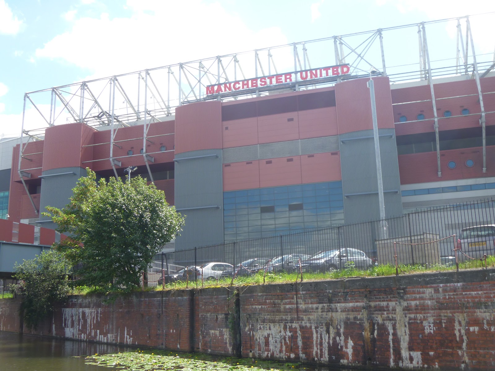 On the other side of the Bridgewater Canal the landscape is dominated by Trafford Park - Manchester United's football stadium.